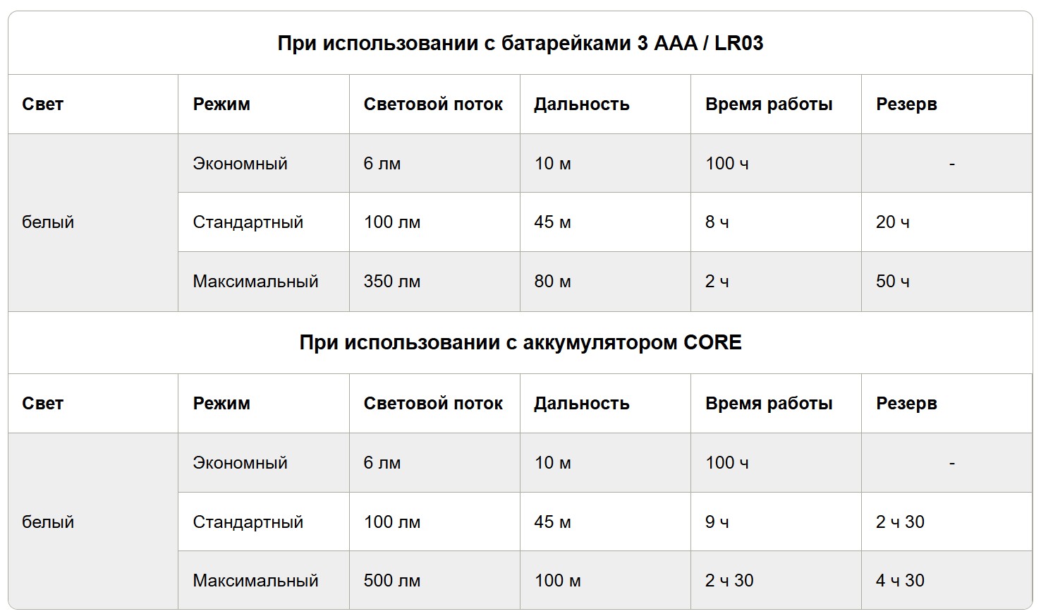 - HYBRID CONCEPT: фонарь также можно использовать с аккумулятором CORE, при этом меняются его характеристики (показатель максимального светового потока при использовании аккумулятора - 500 люмен)